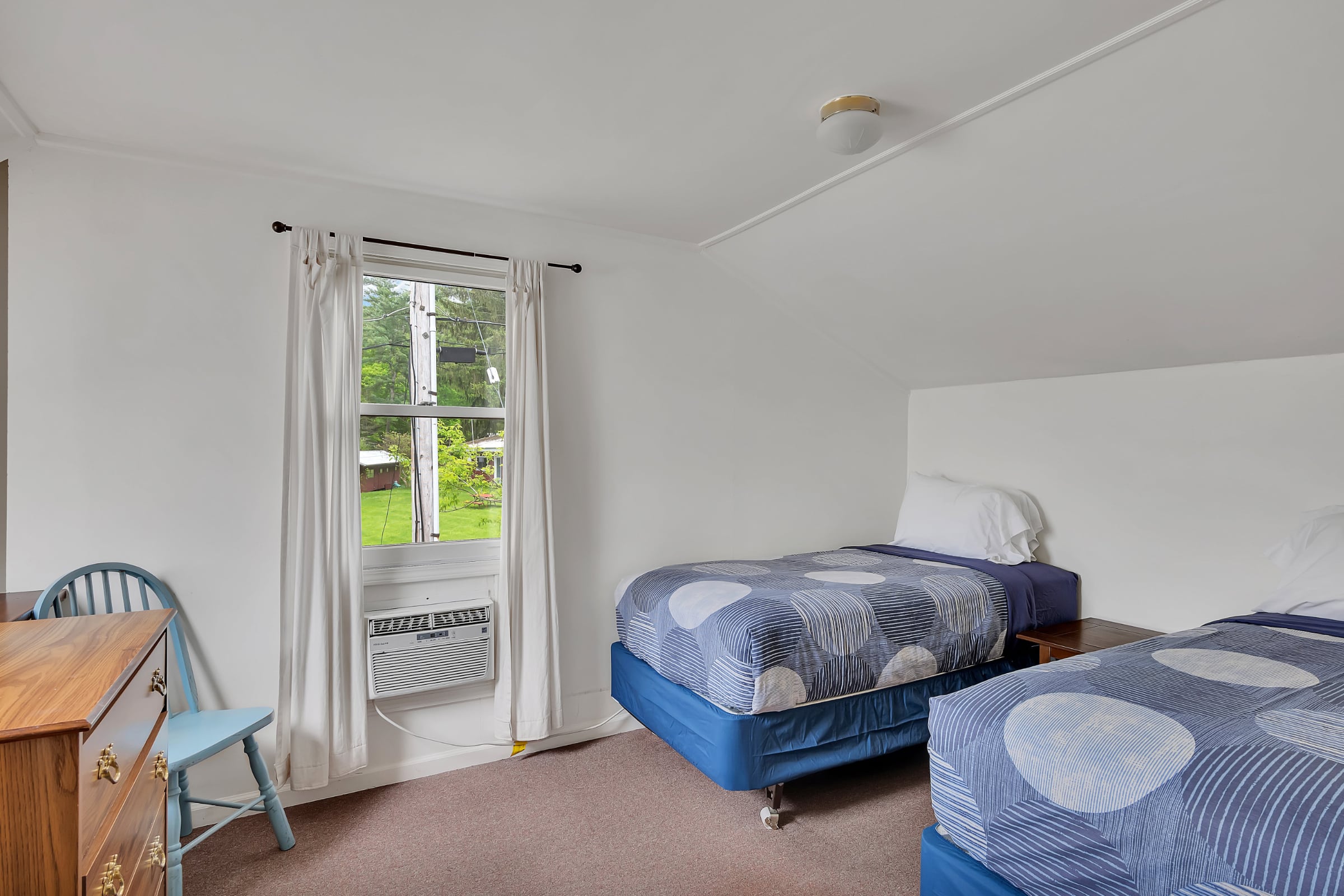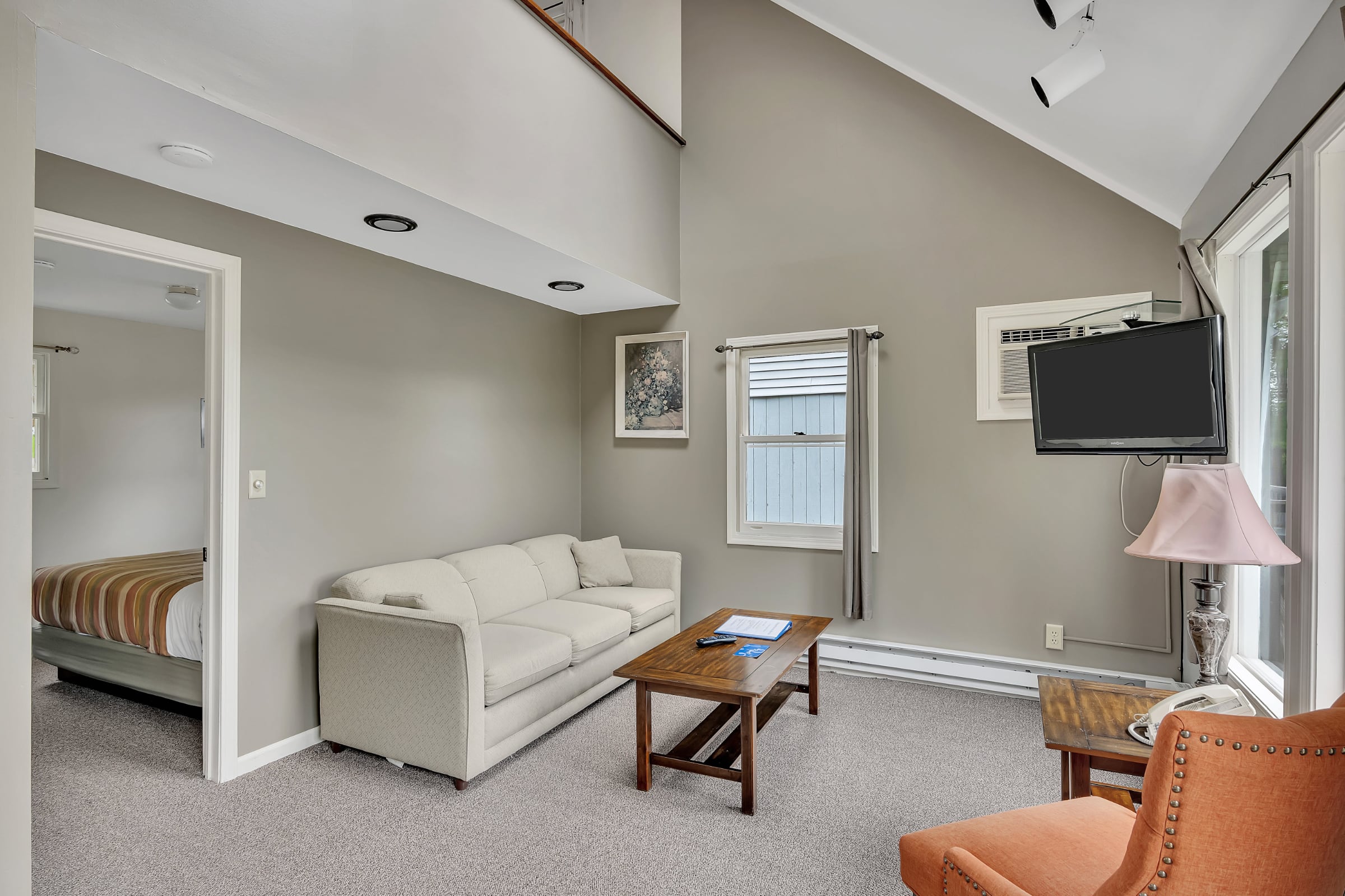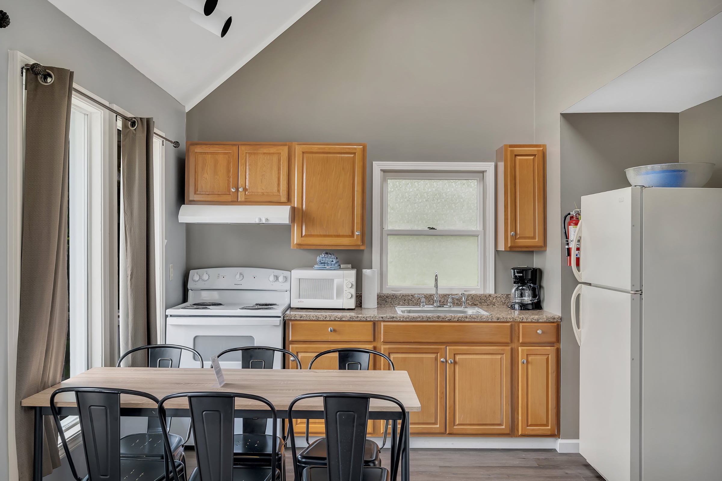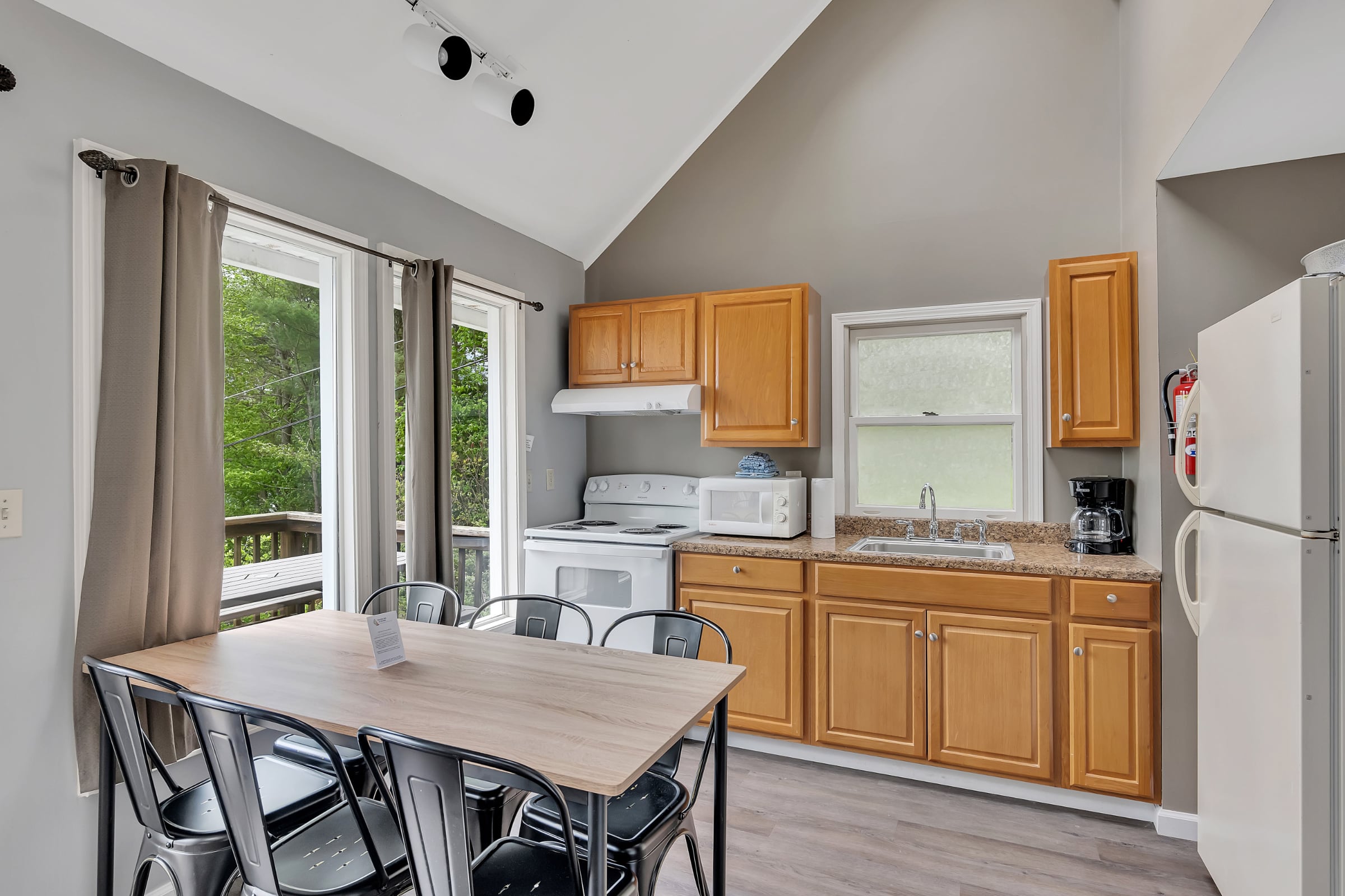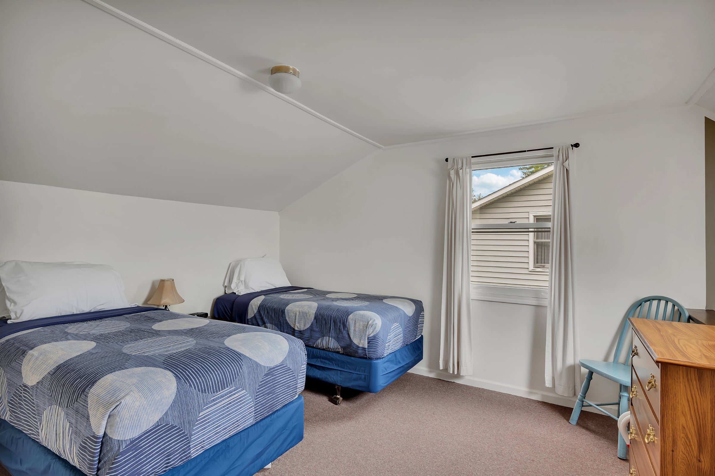 Cottage I is great for families with lots of kids. The sleeping arrangements are: one queen sized bed in the downstairs bedroom, two twin sized beds in each of the two upstairs lofted bedrooms, and a pull-out sofa in the living room.